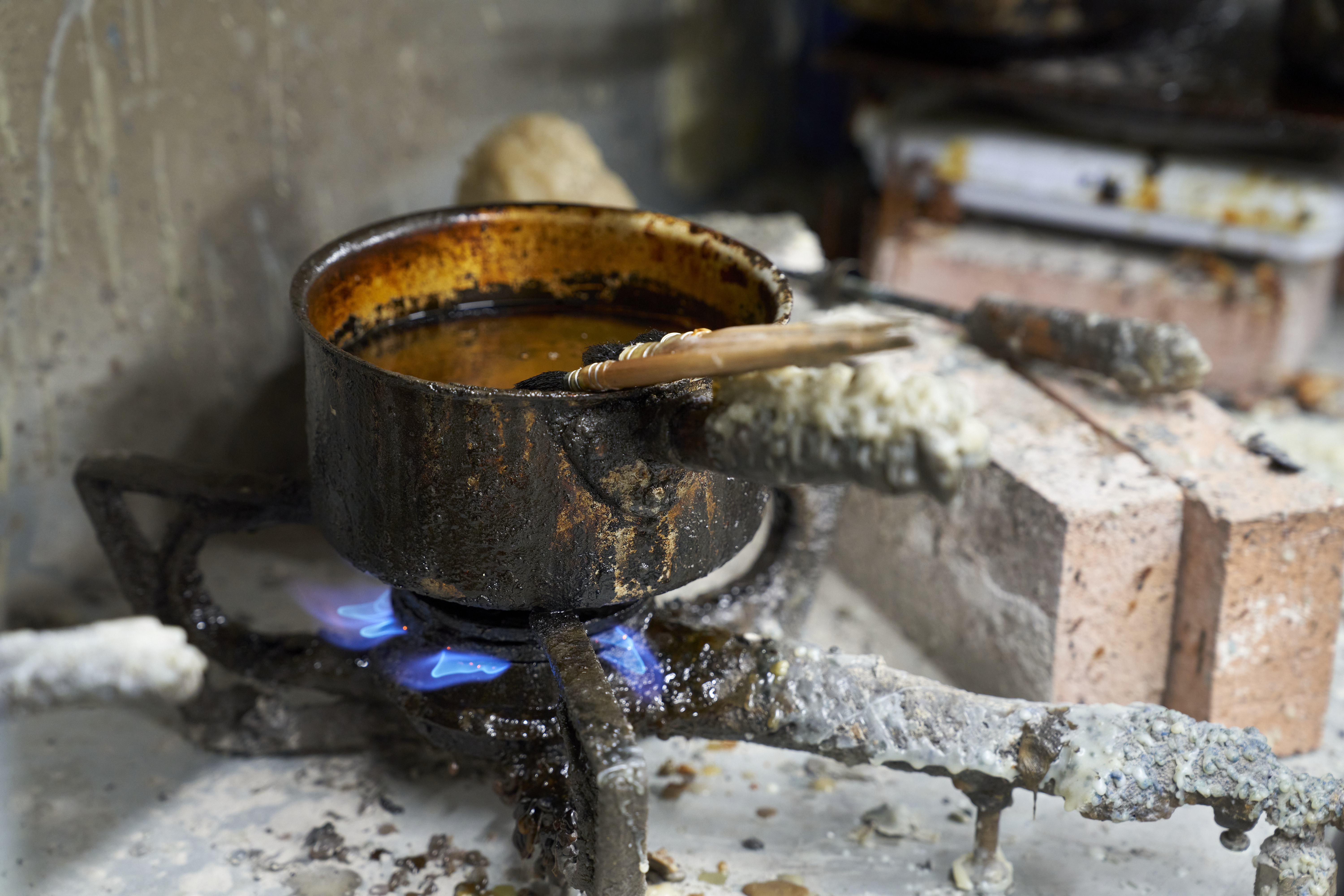 Une fois le montage validé, l’ensemble est placé en cylindre puis coulé sous vide dans un plâtre réfractaire. Le vide permet de limiter les bulles et d’améliorer la fidélité de prise d’empreinte, notamment sur les textures. Après la prise et le séchage, le moule obtenu est prêt pour les étapes suivantes : décirage puis cuisson, avant la coulée du bronze.