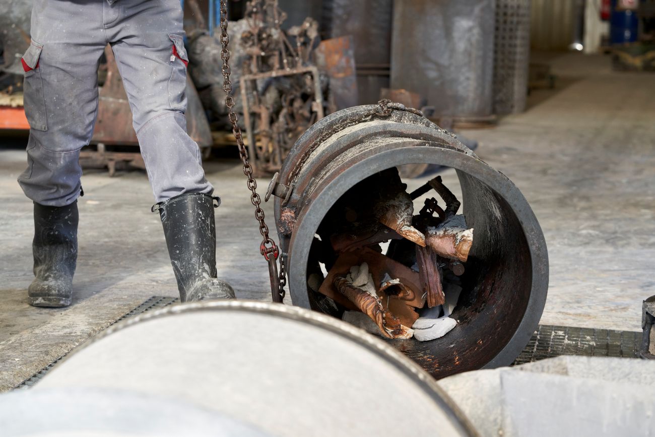 Après décochage, la grappe est découpée pour séparer chaque sculpture de ses alimentations (jets, masselottes, évents). Ces éléments, indispensables à la coulée, sont ensuite refondus : le métal est réintégré au cycle de production et pourra servir à une nouvelle coulée, dans une logique de gestion rigoureuse de la matière.